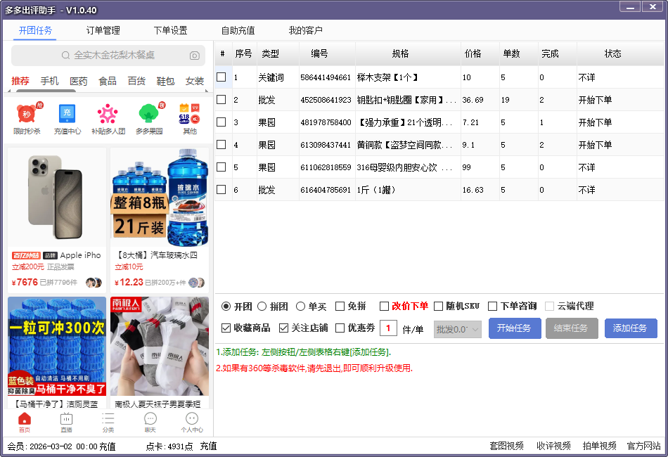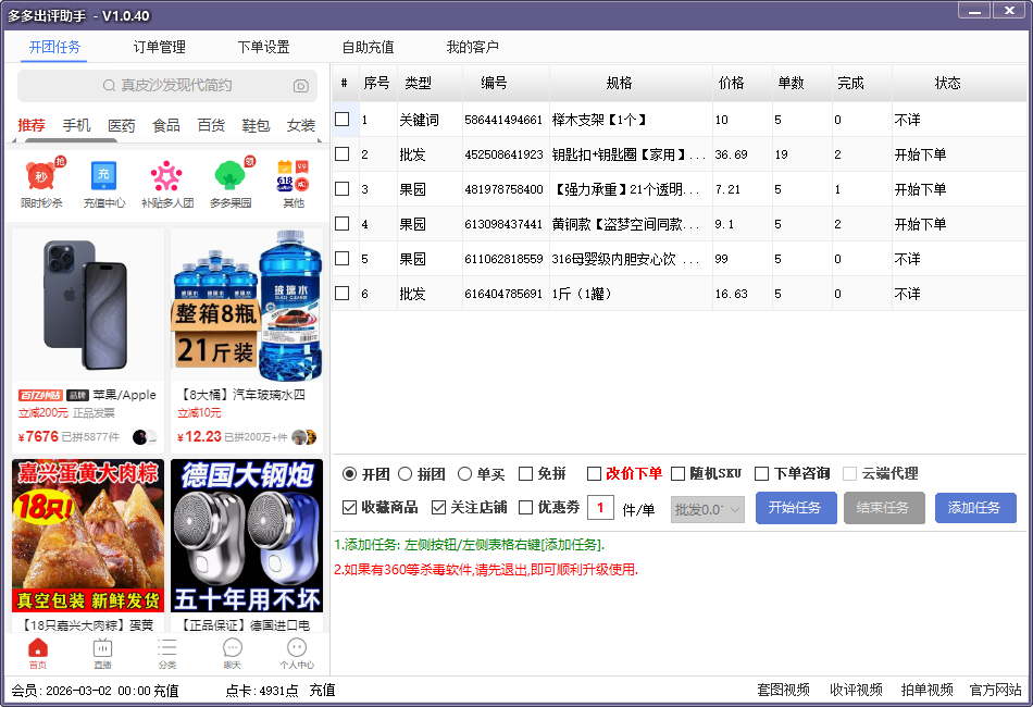 支持多任务下单,批量自动支付,高出评率,独享小号,多渠道下单,全自动操作,上评与追评,批量采集,店铺提升等..