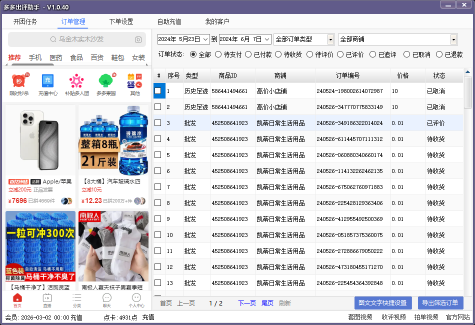 支持多多批发,关键词搜索,多多进宝,多多果园,ID下单,全店铺通道等,多多果园开团稳定有效24小时。全店铺可以做店铺100W销量!